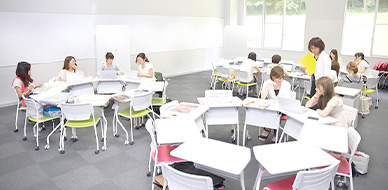 移動式のテーブルと机はグループの人数、授業スタイルに合わせて組み合わせ自在。ノートPC、プロジェクターと壁面を利用した特大スクリーンを設置し、ディスカッションやプレゼンテーションなどが行えます