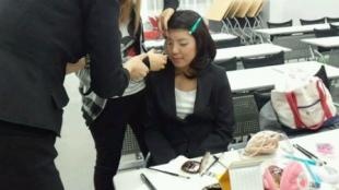 2012年11月9日(金)、ビューティー・キャリアコースの学生と「ブライダル・ファッション」の受講生を対象に、化粧品会社のスタッフをお招きして「パーティーメイクレッスン」が行われました。
