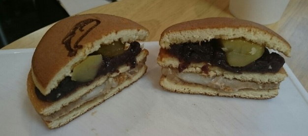 コマロンバーガーは1層目に栗の甘露煮と粒あん、2層目に渋皮入りマロンクリームと白玉の2段構造のどら焼きバーガーです。栗の味を存分に楽しめるものになっています。こちらの写真は試作段階のものです。
