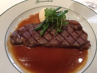 スモークサーモンの前菜、ステーキ、そしてデザートに至るまで、洗練されたお味のおいしいお料理に皆笑顔全開! そして大きなトレーを肩に乗せていくつものお皿を運ぶ料飲のスタッフの方々の手慣れたサービスに目を見張りました。
