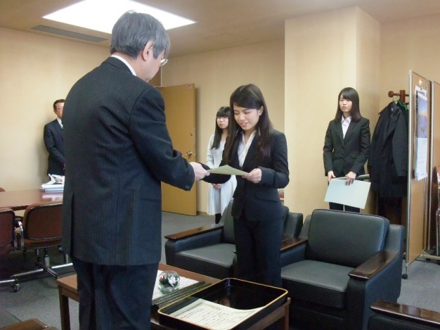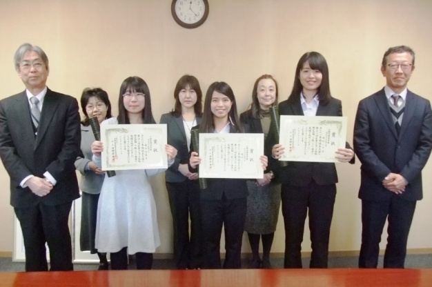 2016年11月に行われた医療秘書教育全国協議会主催の「第57回医療秘書技能検定」、「第42回医事コンピューター技能検定」の成績優秀賞を、本学から3名の学生が受賞し、2017年1月25日(水)に学長室にて、桾沢学長より表彰状が授与されました。