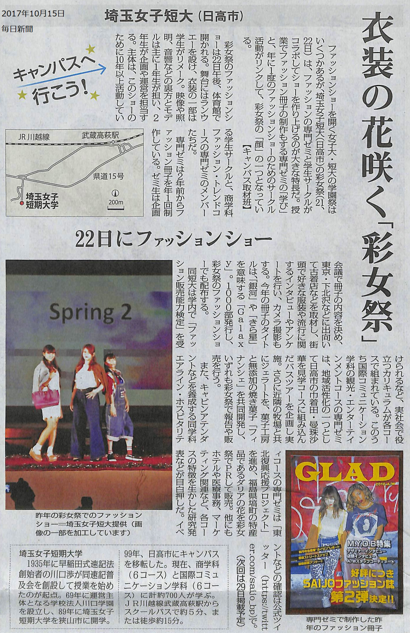 10月15日(日)の毎日新聞埼玉版に本学の彩女祭が紹介されました。