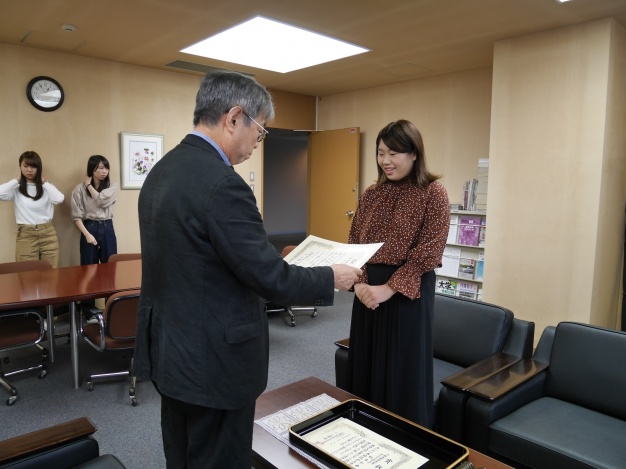 2018年6月に行われた、医療秘書教育全国協議会主催「第60回 医療秘書技能検定試験」および「第45回 医事コンピュータ技能検定試験」の結果において、成績優秀賞を受賞した学生に、2018年9月21日(金)学長室にて桾沢学長より表彰状が授与されました。