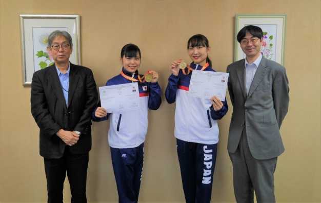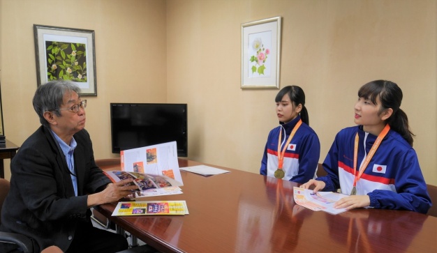 今回の素晴らしい結果を受け、出場した学生2名は学長室を訪問し、金メダルの喜びを桾沢学長に伝えました。