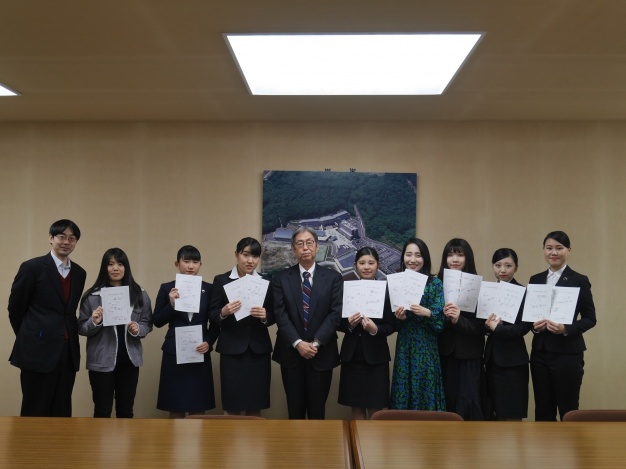 この資格は、旅行会社が企画するツアーや団体旅行に同行するツアーコンダクターに取得が義務づけられており、国内旅行のみ添乗できる「国内旅程管理主任者」と海外旅行の添乗も可能な「総合旅程管理主任者」の2種類があります。本学では、旅行会社に就職を目指す学生の皆さんを対象に対策講座を設けており、多くの学生の皆さんが資格を取得することができました。桾沢学長から一人ひとり表彰状が授与され、皆さんとても嬉しそうな笑顔を見せてくれました。今後も勉学に励み、より一層の活躍を期待します。