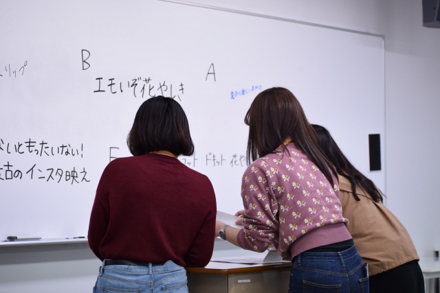 後半のスピーチでは授業やインターンシップ体験、就職活動などをインタビュー形式で紹介しました。みなさんもSAIJO生のリアルな体験談を聞いてみてください!
