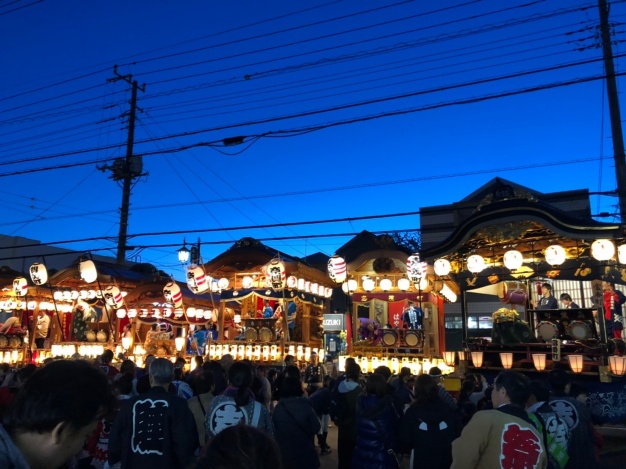 入間市豊岡の愛宕神社の春季例大祭にあわせて行われるこのおとうろうまつりは、天保7年に造られた志茂町山車の他、神様を乗せた数台の山車が街に繰り出すという江戸情緒漂う祭りです。元々「雨乞い」の意味合いがあり、今回も初日は冷たい春雨の中の催しとなりました。
