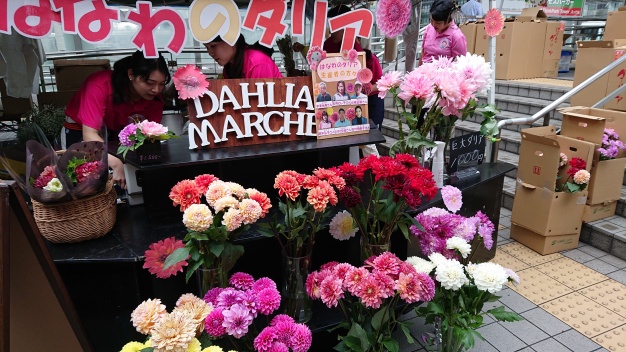 エアライン専門ゼミでは、9月13日~15日までの3日間、東京都内の2ヶ所で福島県塙町のダリア約1500本を販売し、町のPR活動をしました。