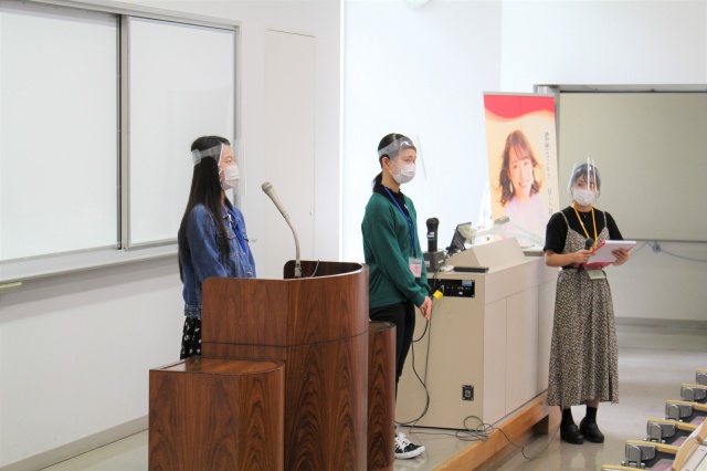 後半のSAIJO生のスピーチでは授業やインターンシップ体験、就職活動などを紹介しました。