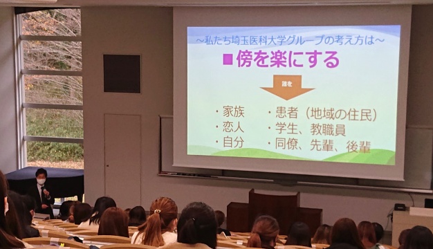 前半は、働く本質・生き方についてお話いただきました。埼玉医科大学では「働く」ということを「傍(はた)を楽にする」という捉え方をされています。私たちも、日々思いやりを持って行動することで、自然と誰かを助けることができるような人間になりたいと思いました。