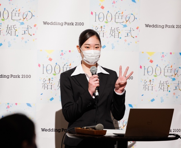 登壇者の芥川賞作家でお笑い芸人の又吉直樹さん、ブライダルファッションデザイナーの桂由美さん、株式会社ウエディングパーク代表取締役の日紫喜さんに向けて発表しました。(全文は下記URLよりご覧いただけます)