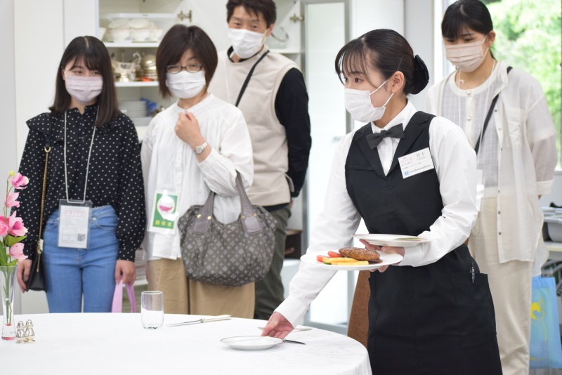 オープンキャンパス後半には、SAIJO生が案内するキャンパスツアーへ!この日は、資格取得を目指すSAIJO生が対策講座で勉強している風景もちょっぴり目にすることができました!レストランサービス技能検定に挑戦するSAIJO生は、立ち寄った高校生の前でサービスを披露してくれました。