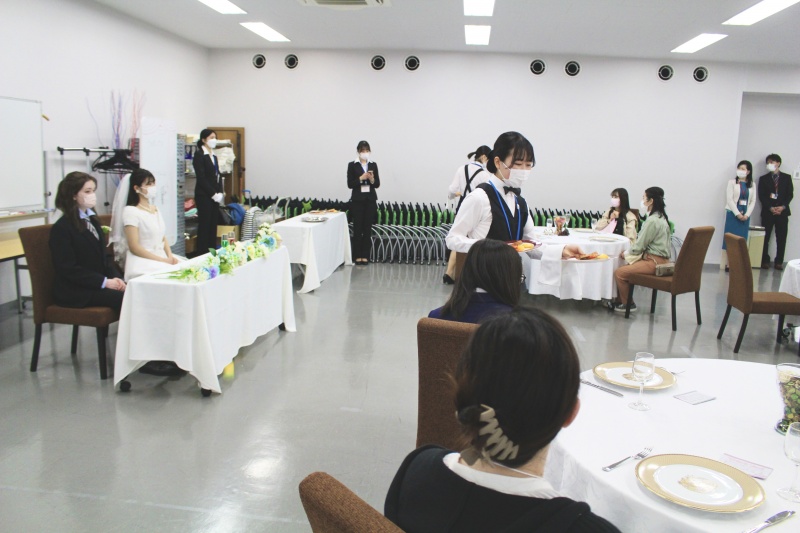 披露宴会場風にセッティングされた教室で、進行にあわせてウェディング衣裳、バンケットサービスを披露していました。限られた時間のなかで、SAIJOで学んでいる知識をたくさん伝えたいというSAIJO生の想いが伝わる発表でした。