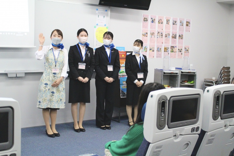 機内空間を楽しめるエアライン教室では、バーチャルフライト&韓国観光を擬似体験しているような演出と空港見学や実習形式の授業の様子、韓国語系資格やオンライン海外留学などSAIJO生目線でそれぞれのコースにまつわるニュースを紹介してくれました。