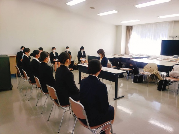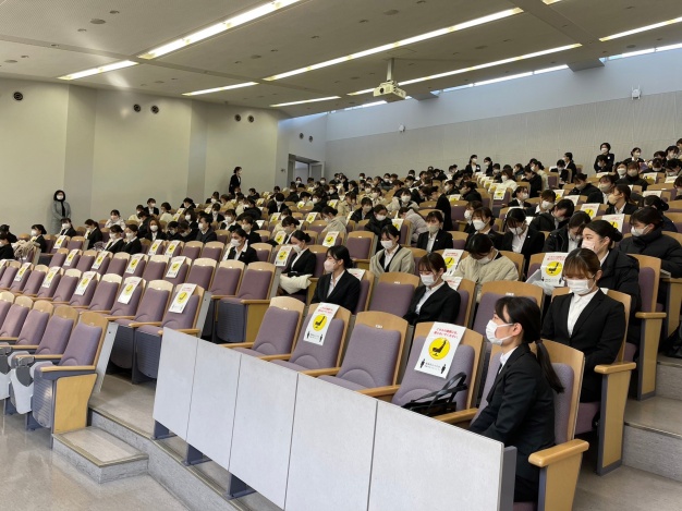 まず大教室に集まり、外部講師の先生方より面接で大切なことや入退室のレクチャーを受けました。そこでは学生同士ペアになり、「好きな食べ物、嫌いな食べ物」を想像するワークなどアイスブレイクを行い、緊張をほぐしていきました。