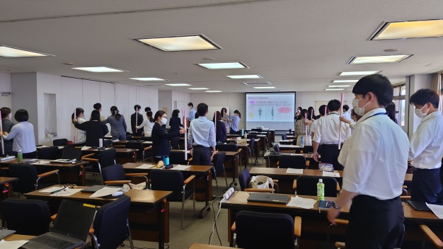 実習では恒例のSAIJO棒を使用し基本の立ち姿勢から、3種類のお辞儀をペアで行っていただきました。各自それぞれのご自身の癖を認識しながら綺麗なお辞儀をめざして、楽しそうに且つ真剣に取り組んでくださっていました。