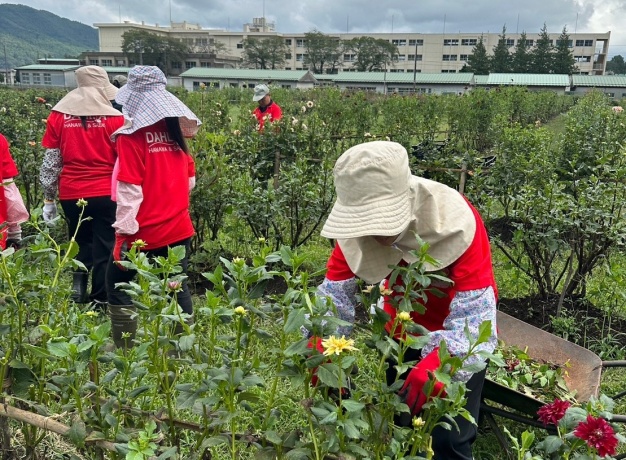 この研修は、2016年から毎年、町の花である「ダリア」栽培の講義と実技を受けたり、また、地元の農家さんとの交流を通じて、町の野菜や観光地についての勉強をしています。