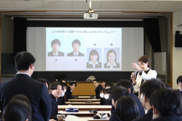 「第一印象」を良くするためにまずは「笑顔」の練習を行いました。マスクを着用している場合、笑顔が伝わりにくくなります。迎え入れてくださる企業の方に感謝の気持ちを伝えるため、ペアで向かい合い笑顔の練習を行いました。