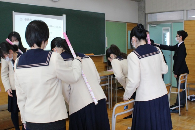 オリジナルの“SAIJO棒“ を使用して、会釈・普通礼・最敬礼の3種類のお辞儀をペアワークで実践しました。少々苦戦する生徒さんもいらっしゃいましたが、和気あいあいとした雰囲気のなか、お互いに声をかけ合いながら一生懸命取り組む姿は大変美しいものでした。