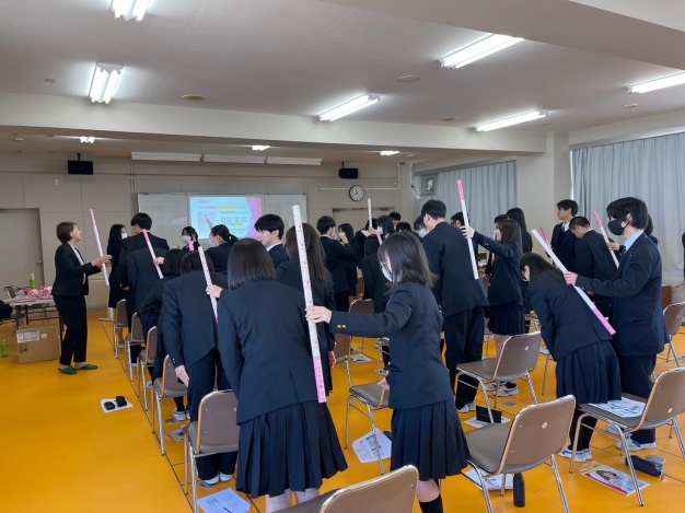 続いて「敬語」の使い方について説明した後、「挨拶」の重要性とポイント、美しい立ち方の練習を本学オリジナルの”SAIJO棒”を使用して行いました。”SAIJO棒”を使い、背中が丸まっていないか、何人かの生徒に前に出てもらい、見本となっていただきました。その後、ペアになりお互いにどうやったらうまくできるか確認していただきました。