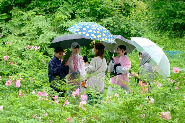 エアライン専門ゼミは、2016年からこの花の群生地の環境保護活動を行っています。8年目となる今年は、2年生8名と1年生の有志7名で、初のゼミ遠征となる西会津安座地区の「おとめゆり祭り」の運営に参加しました。