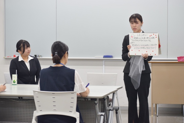 SAIJOの学科・コース関係ない学び<教養・キャリア科目>であるマナー・ホスピタリティの授業では、正しいお辞儀の仕方をレクチャー!