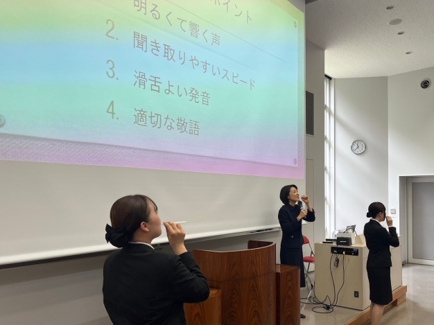 元放送局のキャスターでいらっしゃる鳴海様から話すときのポイントも伝授していただきました。ポイントは1明るくて響く声、2聞き取りやすいスピード、3滑舌良い発音、4適切な敬語とのこと。