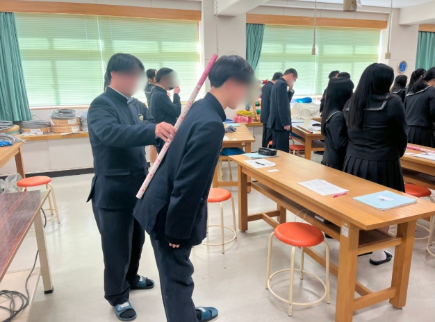 立ち居振る舞いでは、本学オリジナルの「SAIJO棒」を使って3つのお辞儀を練習しました。ポイントを押さえて取り組んでいてとても綺麗なお辞儀ができていました。