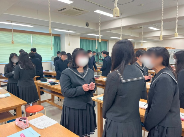 卒業後の進路が決定している高校3年生の男女125名を対象にビジネスマナー講座を行いました。2つの教室に分かれ講師2名が同時進行で実施しました。