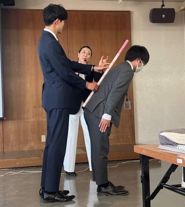 本学のオリジナル教材 “SAIJO棒” を使用して基本の「立ち姿」や「お辞儀」の練習をしました。