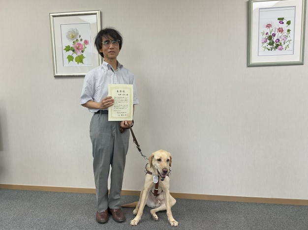 星野先生は福祉や介護の科目を担当してSAIJO歴25年! 星野先生の体験を踏まえた授業は、四半世紀にわたって学生からの人気を集めています。表彰式には、四代目盲導犬のラックくんの姿もありました。