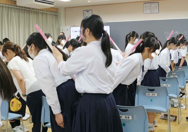 本学オリジナル教材の「SAIJO棒」を使用して、美しいお辞儀の練習をしました。