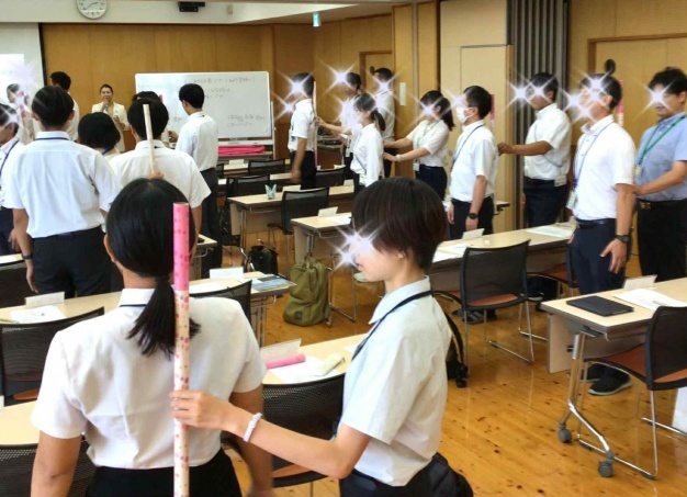 「美しい立ち居振る舞い」では、本学オリジナルのSAIJO棒を使用して、基本の立ち姿勢とお辞儀の姿勢の実践練習です。ペアワークでは、昨年度に続いて2度目の受講の先生方がしっかりとリーダーシップを発揮してくださり、大変スムーズに進みました。