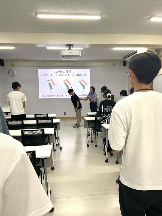 特に、お辞儀の練習では、楽しそうに取り組む姿が印象的でした。上手にできた生徒には前に出てもらい、皆のお手本になってもらう一幕もあり、活気にあふれた時間となりました。「知らないことがたくさんあると知れた。これからは気を付けていきたい」という感想も聞かれ、マナーを自分ごととして捉えてくれたことを大変嬉しく思います。