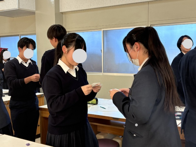 初めは緊張気味だった生徒たちも、回を重ねるうちに笑顔が増え、積極的に取り組む姿が見られました。お辞儀の練習では、互いに姿勢を確認し合いながら取り組み、名刺交換では礼儀正しい言葉遣いや渡し方を学びながら、自然と笑顔がこぼれる場面もありました。会場は終始明るく、和やかな雰囲気に包まれていました。