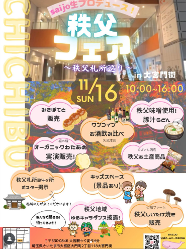 2025年11月16日(日)、三ツ木専門ゼミナールが大宮門街にて「SAIJO生プロデュース! 秩父フェア ~秩父礼所巡り~」を開催します!