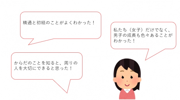 今回授業に参加した小学4年生の皆さんは、これから思春期を迎え、大人へと成長していきます。男女が互いのからだの成長の過程を知ることは、よりよい学校生活や社会生活を過ごす上で、重要なことだと考えます。