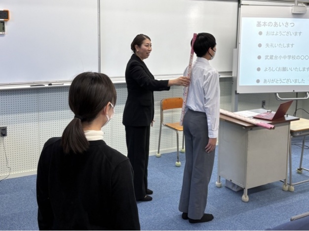 続いて、本学オリジナル教材の「SAIJO棒」を使用して、基本の立ち姿勢から美しいお辞儀を実習です。笑顔を大切に、心のこもった挨拶と美しいお辞儀を練習しました。